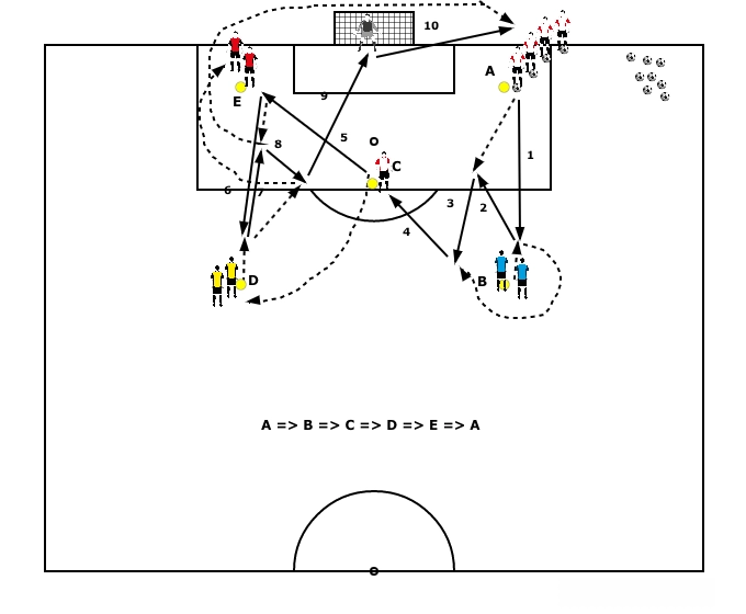 Na de combinatie neemt speler D de bal aan en werkt af in de handen van de doelman.