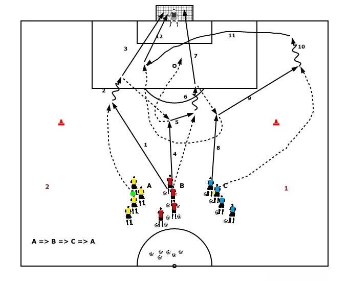 Speler A probeert de bal in één keer door te spelen naar speler E, die de bal, indien mogelijk ook in één keer, doorspeelt naar speler C.