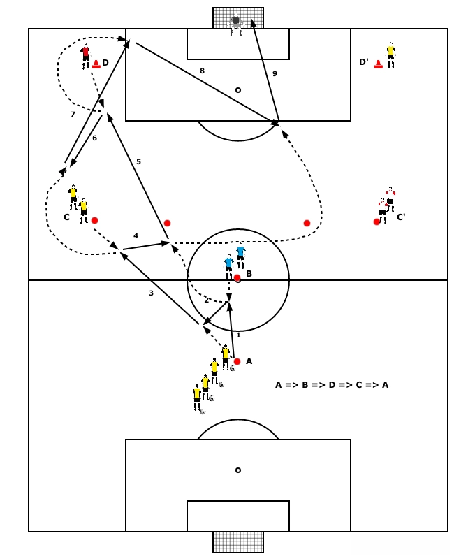 Player B passes the ball to the requesting player D and then starts a run towards the goal.