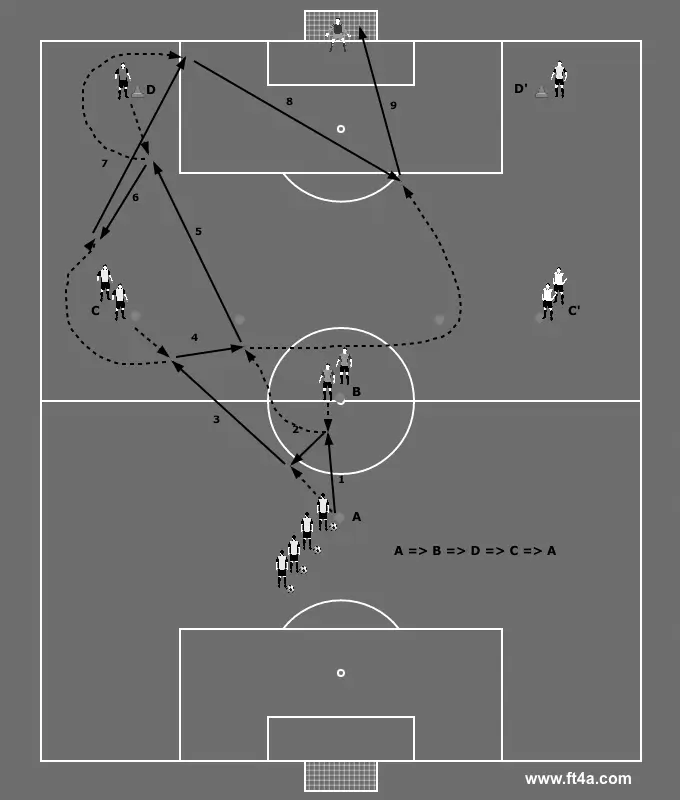 Speler D kaatst de bal terug naar de inlopende speler C.